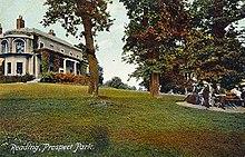 Prospect Park is a public park in the western suburbs of Reading situated north of the Bath Road in the English county of Berkshire. It is the largest and most popular park in Reading, and includes a large regency style house, now known as Prospect Park Mansion House and previously as Prospect House. There are also sporting facilities and a miniature railway within the 50 hectares (120 acres) of parkland, and a restaurant in the Mansion House.[1][2]