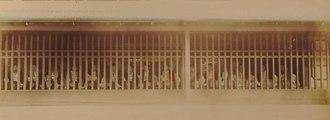 Prostitutes and courtesans were licensed as yūjo (遊女), "women of pleasure", and ranked according to an elaborate hierarchy, with tayū and later oiran at the apex.[11] The districts were walled and guarded for taxation and access control.[10] The prostitutes were rarely allowed out of the walls,[10] except to visit dying relatives[13] and, once a year, for hanami (viewing cherry blossoms).[14]