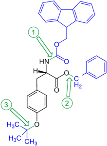 A common example for this application, the Fmoc-peptide synthesis, in which peptides are grown in solution and on solid phase is very important.[6] The protecting groups in solid-phase synthesis with regard to the reaction conditions such as reaction time, temperature and reagents can be standardized so that they are carried out by a machine, while yields of well over 99% can be achieved. Otherwise, the separation of the resulting mixture of reaction products is virtually impossible.[7]