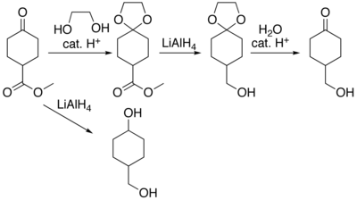 In many preparations of delicate organic compounds, some specific parts of their molecules cannot survive the required reagents or chemical environments. Then, these parts, or groups, must be protected. For example, lithium aluminium hydride is a highly reactive but useful reagent capable of reducing esters to alcohols. It will always react with carbonyl groups, and this cannot be discouraged by any means. When a reduction of an ester is required in the presence of a carbonyl, the attack of the hydride on the carbonyl has to be prevented. For example, the carbonyl is converted into an acetal, which does not react with hydrides. The acetal is then called a protecting group for the carbonyl. After the step involving the hydride is complete, the acetal is removed (by reacting it with an aqueous acid), giving back the original carbonyl. This step is called deprotection.