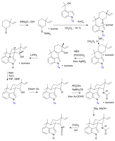 ![]() Hideaki Muratake's 1990 synthesis using Tosyl protecting groups (shown in blue). |