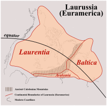 "Laurussia" was defined by Swiss geologist Peter Ziegler in 1988 as the merger between Laurentia and Baltica along the northern Caledonian suture. The "Old Red Continent" is an informal name often used for the Silurian-Carboniferous deposits in the central landmass of Laurussia.[6]