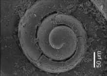 Detail of apical view of the same shell showing clearly visible protoconch, that has 2¼ whorls |