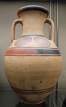 The Protogeometric style (or "Proto-Geometric") is a style of Ancient Greek pottery led by Athens produced between roughly 1030 and 900 BCE,[1] in the first period of the Greek Dark Ages.[2] After the collapse of the Mycenaean-Minoan Palace culture and the ensuing Greek Dark Ages, the Protogeometric style emerged around the mid 11th century BCE as the first expression of a reviving civilization. Following on from the development of a faster potter's wheel, vases of this period are markedly more technically accomplished than earlier Dark Age examples. The decoration of these pots is restricted to purely abstract elements and very often includes broad horizontal bands about the neck and belly and concentric circles applied with compass and multiple brush. Many other simple motifs can be found, but unlike many pieces in the following Geometric style, typically much of the surface is left plain.[3]