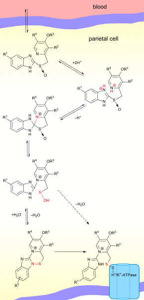 The PPIs are given in an inactive form, which is neutrally charged (lipophilic) and readily crosses cell membranes into intracellular compartments (like the parietal cell canaliculus) with acidic environments. In an acid environment, the inactive drug is protonated and rearranges into its active form. As described above, the active form will covalently and irreversibly bind to the gastric proton pump, deactivating it.