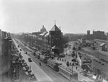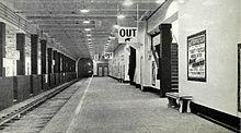 By the 1930s, auto traffic through Copley Square and Boylston Street (which, unlike Huntington Avenue, lacked dedicated medians for trolleys) caused major delays to streetcars. Mechanics station (named for nearby Mechanics Hall) and Symphony station were opened on February 16, 1941, as the two new stations of the Huntington Avenue subway project.[1] The project was constructed by the Works Progress Administration during the Great Depression and allowed streetcars from Huntington Avenue to go underground through Copley Square, cutting 15 minutes off trip times.[3]