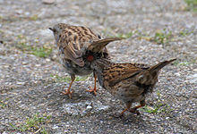 The dunnock possesses variable mating systems. Females are often polyandrous, breeding with two or more males at once,[20][21] which is quite rare among birds. This multiple mating system leads to the development of sperm competition amongst the male suitors. DNA fingerprinting has shown that chicks within a brood often have different fathers, depending on the success of the males at monopolising the female.[17] Males try to ensure their paternity by pecking at the cloaca[22] of the female to stimulate ejection of rival males' sperm.[23] Dunnocks take just one-tenth of a second to copulate and can mate more than 100 times a day.[24] Males provide parental care in proportion to their mating success, so two males and a female can commonly be seen provisioning nestlings at one nest.