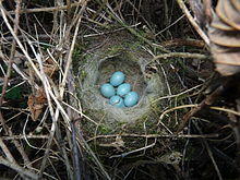 The dunnock builds a nest (predominantly from twigs and moss and lined with soft materials such as wool or feathers), low in a bush or conifer, where adults typically lay three to five unspotted blue eggs.[15]