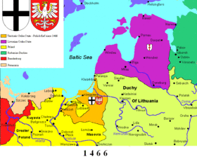 The expansion of Prussia based on its connection with the Hanseatic League cut both Poland and Lithuania off from the coast of the Baltic Sea and trade abroad.[10] This meant that Poland and Lithuania would be traditional enemies of Prussia, which was still called the Teutonic Knights.[11]