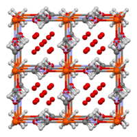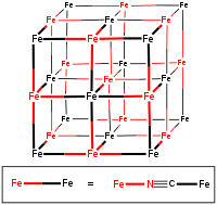 The Fe(II) centers, which are low spin, are surrounded by six carbon ligands in an octahedral configuration. The Fe(III) centers, which are high spin, are octahedrally surrounded on average by 4.5 nitrogen atoms and 1.5 oxygen atoms (the oxygen from the six coordinated water molecules). Additional eight (interstitial) water molecules are present in the unit cell, either as isolated molecules or hydrogen bonded to the coordinated water.