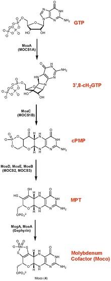 Molybdopterin biosynthesis occurs in four steps: (i) the radical-mediated cyclization of nucleotide, guanosine 5'-triphosphate (GTP), to (8S)‑3 ́,8‐cyclo‑7,8‑dihydroguanosine 5 ́‑triphosphate (3 ́,8‑cH2GTP), (ii) the formation of cyclic pyranopterin monophosphate (cPMP) from the 3 ́,8‑cH2GTP, (iii) the conversion of cPMP into molybdopterin (MPT), (iv) the insertion of molybdate into MPT to form Moco (molybdenum cofactor). The human enzymes are indicated in parenthesis.[7]