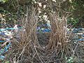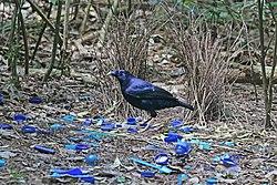 Like all bowerbirds, the satin bowerbird shows highly complex courtship behaviour. Mate choice in satin bowerbirds has been studied in detail.[7] Males build specialised stick structures, called bowers, which they decorate with blue, yellow, and shiny objects, including berries, flowers, and plastic items such as ballpoint pens, drinking straws and clothes pegs. As the males mature they use more blue objects than other colours. Females visit these and choose which male they will allow to mate with them. In addition to building their bowers, males carry out intense behavioural displays called dances to woo their mates, but these can be treated as threat displays by the females. Nestbuilding and incubation are carried out by the females alone.