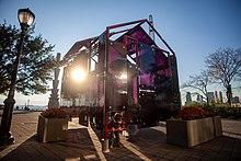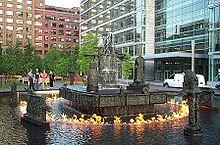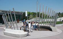Some public art is designed to encourage direct hands-on interaction. Examples include public art that contain interactive musical, light, video, or water components. For example, the architectural centerpiece in front of the Ontario Science Centre is a fountain and musical instrument (hydraulophone) by Steve Mann where people can produce sounds by blocking water jets to force water through sound-producing mechanisms. An early and unusual interactive public artwork was Jim Pallas' 1980 Century of Light in Detroit, Michigan[31] of a large outdoor mandala of lights that reacted in complex ways to sounds and movements detected by radar (mistakenly destroyed 25 years later[32]).