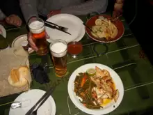 Traditionally pubs in England were drinking establishments and little emphasis was placed on the serving of food, other than "bar snacks", such as pork scratchings,[52] and pickled eggs, along with salted crisps and peanuts which helped to increase beer sales. If a pub served meals they were usually basic cold dishes such as a ploughman's lunch.[53] In South East England (especially London) it was common until recent times for vendors selling cockles, whelks, mussels and other shellfish, to sell to customers during the evening and at closing time. Many mobile shellfish stalls would set up near pubs, a practice that continues in London's East End. Otherwise, pickled cockles and mussels may be offered by the pub in jars or packets
