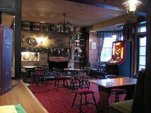 It was the pub that first introduced the concept of the bar counter being used to serve the beer. Until that time beer establishments used to bring the beer out to the table or benches.[29] A bar might be provided for the manager to do his paperwork while keeping an eye on his customers, but the casks of ale were kept in a separate taproom. When the first pubs were built, the main room was the public room with a large serving bar copied from the gin houses, the idea being to serve the maximum number of people in the shortest possible time. It became known as the public bar. The other, more private, rooms had no serving bar—they had the beer brought to them from the public bar. There are a number of pubs in the Midlands or the North which still retain this set up but these days the beer is fetched by the customer from the taproom or public bar. One of these is The Vine, known locally as The Bull and Bladder, in Brierley Hill near Birmingham. In the Manchester district the public bar was known as the "vault", other rooms being the lounge and snug as usual elsewhere. By the early 1970s there was a tendency to change to one large drinking room and breweries were eager to invest in interior design and theming.[30]