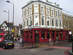 By the end of the 18th century a new room in the pub was established: the saloon. Beer establishments had always provided entertainment of some sort—singing, gaming or sport. Balls Pond Road in Islington was named after an establishment run by a Mr Ball that had a duck pond at the rear, where drinkers could, for a fee, go out and take a potshot at the ducks.[25] More common, however, was a card room or a billiard room. The saloon was a room where for an admission fee or a higher price of drinks, singing, dancing, drama or comedy was performed and drinks would be served at the table. From this came the popular music hall form of entertainment—a show consisting of a variety of acts. A most famous London saloon was the Grecian Saloon in The Eagle, City Road, which is still famous because of a nursery rhyme: "Up and down the City Road / In and out The Eagle / That's the way the money goes / Pop goes the weasel."[26] This meant that the customer had spent all his money at The Eagle, and needed to pawn his "weasel" to get some more.[26] The meaning of the "weasel" is unclear but the two most likely definitions are: a flat iron used for finishing clothing; or rhyming slang for a coat (weasel and stoat).[27]