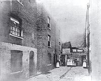 ... roads were unmade, often mere alleys, houses small and without foundations, subdivided and often around unpaved courts. An almost total lack of drainage and sewerage was made worse by the ponds formed by the excavation of brickearth. Pigs and cows in back yards, noxious trades like boiling tripe, melting tallow, or preparing cat's meat, and slaughter houses, dustheaps, and "lakes of putrefying night soil" added to the filth.[3]