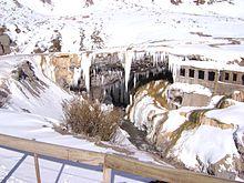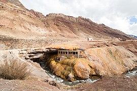 Puente del Inca (Spanish "The Inca Bridge"), is a natural arch that forms a bridge over the Las Cuevas River, a tributary of the Mendoza River. It is located in Mendoza Province, Argentina, near Las Cuevas. The nearby hot springs are also named Puente del Inca.[1]