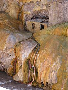 Both glaciers and the hot springs were involved in the formation of the arch. During an ice age, glaciers would have expanded down throughout the entire valley; then, at the end of the ice age when the Earth began to warm up again, the retreating ice would have left behind massive piles of eroded debris.[1] The water that flows from the hot springs is extremely rich in mineral content, to the point that it has been known to petrify small objects in a layer of minerals. Similarly, the piles of debris left by the glaciers were encrusted over time into a single solid mass.[1] Finally, during a period where the climate was extremely wet, a powerful river formed in the valley. It cut a channel through the lower, least encrusted layers of debris, which gradually eroded into the large opening of the arch.