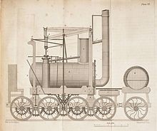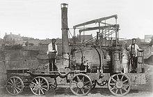 In 1810 the Durham Coalfield was disrupted by a major strike over the Bond system.[3][4] During this time Christopher Blackett, owner of the Wylam Colliery, took advantage of the pit's idleness to experiment with the idea of a locomotive-hauled tramway worked purely by adhesion, rather than the Blenkinsop rack system used on the Middleton.[5] These began with a simple hand-cranked wagon, converted from a coal wagon chassis with the addition of a central drive shaft and geared drives to the axles.[6]