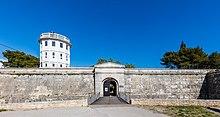 In 1813, Pola (with Istria) came back to the Austrian Empire. Under the compromise of 1867, the town – under the original Italian name, Pola – remained in Austria-Hungary until the latter's defeat and dissolution in 1918.[19] Under Austrian rule, Pola regained prosperity. Its large natural harbour became Austria's main naval base and a major shipbuilding centre.[20][21] It was chosen for the base in 1859 by Hans Dahlerup, a Danish admiral in the service of Austria.[18] Subsequently, Pola grew from a fading provincial town into an industrial city. The island of Brioni (in Croatian renamed Brijuni) to the North West of Pola became the summer vacation resort of Austria's Habsburg royal family. In World War I, the port was the main base for Austro-Hungarian dreadnoughts and other naval forces of the Empire.[20] During this period many inhabitants were Italian speaking. The 1910 Austrian census recorded a city population of 58,562 (45.8% Italian speaking; 15.2% Croatian, the rest were mostly German-speaking military).[22]