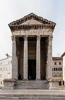 Two other notable and well-preserved ancient Roman structures are the 1st-century AD triumphal arch, the Arch of the Sergii and the co-eval Temple of Augustus, built in the 1st century AD built on the forum during the reign of the Roman emperor Augustus.