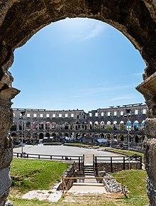 A great amphitheatre, Pula Arena, was constructed between 27 BC and 68 AD,[12] much of it still standing to this day. The Romans also supplied the city with a water supply and sewage systems. They fortified the city with a wall with ten gates. A few of these gates still remain: the triumphal Arch of the Sergii, the Gate of Hercules (in which the names of the founders of the city are engraved) and the Twin Gates. During the reign of emperor Septimius Severus the name of the town was changed to "Res Publica Polensis". The town was the site of Crispus Caesar's execution in 326 AD and Gallus Caesar's execution in 354 AD. In 425 AD the town became the centre of a bishopric, attested by the remains of foundations of a few religious buildings.[7]