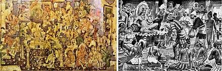 In the 1870s, architectural historian James Fergusson theorized that a painting at the Ajanta Cave 1 depicted a Sasanian embassy to Pulakeshin's court. The painting depicts several figures in foreign dress: Fergusson identified the dress as Sasanian, and proposed that the Sasanian king sent a return embassy to the Chalukya kingdom.[81] This theory was widely accepted by other scholars, but is no longer considered correct:[79] the painting, which does indeed include the visit of foreigners in Persian or Sassanian dress, actually depicts a scene from the Maha-sudarsana Jataka, in which the enthroned king can be identified as the Buddha in one of his previous births as a King.[80] The inclusions of numerous men in Sassanian clothing in the caves of Ajanta seems to reflect the great number of Sassanian traders or workers in Central Indian at that time, and the fact that they were an object of intense interest by the Indians.[80]