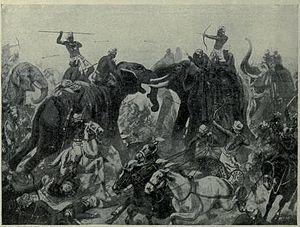 According to Xuanzang, the king was war-like and loved "military arts", because he was a Kshatriya by birth.[53] His well-disciplined troops comprised several thousands of men, and several hundreds of elephants. The elephants, who were intoxicated with wine before battles, were used to break the enemy's front line. When his generals were defeated, they were not punished, but were humiliated by being ordered to wear women's dresses.[53] The soldiers who lost a battle would commit suicide as a matter of honour.[52]