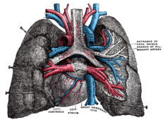 At the root of the lung, the right superior pulmonary vein lies in front of and a little below the pulmonary artery; the inferior is situated at the lowest part of the lung hilum. Behind the pulmonary artery is the bronchus.[2] The right main pulmonary veins (contains oxygenated blood) pass behind the right atrium and superior vena cava; the left in front of the descending thoracic aorta.