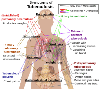 Tuberculosis (TB) is an infectious disease usually caused by Mycobacterium tuberculosis (MTB) bacteria.[1] Tuberculosis generally affects the lungs, but can also affect other parts of the body.[1] Most infections show no symptoms, in which case it is known as latent tuberculosis.[1] About 10% of latent infections progress to active disease which, if left untreated, kills about half of those affected.[1] The classic symptoms of active TB are a chronic cough with blood-containing mucus, fever, night sweats, and weight loss.[1] It was historically called consumption due to the weight loss.[8] Infection of other organs can cause a wide range of symptoms.[9]
