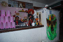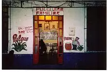 Most pulque is consumed in bars called pulquerías. At the beginning of the 20th century, more than 1,000 were located in Mexico City alone.[8] By the early 20th century, pulquerías became socially accepted, and some were places of great elegance. But whether for rich or poor, two features stood out among these establishments: odd or catchy names, and murals decorating the walls. Names included (translated) "My Office", "Memories of the Future", "Drink and Go", "I'm Waiting for You Here at the Corner", and, across the street from the National Chamber of Deputies, "The Recreation Center of Those Across the Street". Diego Rivera once said one of the most important manifestations of Mexican painting was the murals that decorated the facades and interiors of pulquerías. One tradition maintained at all pulquerias at the beginning of the 20th century was to put sawdust on the floor. The tradition at that time was to begin a pulque-drinking session by spilling a little on the floor or ground as an offering to Mother Earth.[34] Traditional pulquerías tend to be like clubs with closed membership, with casual visitors ignored or sometimes stared at. Frequent visits and large consumption of the drink tends to win acceptance.[8] While some establishments may forbid women,[8] it is much more common for the establishment to provide a separate seating area for them. Intermingling of the sexes is not permitted.[35][36][37] In the more rural areas of Hidalgo and Tlaxcala, where most pulque is made, the pulque is fresher and better. A vendor usually displays a white flag over the door when a fresh shipment has arrived.[8]