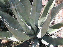 The maguey plant, also called a "century plant" in English, is native to Mexico. It grows best in the cold, dry climates of the rocky central highlands to the north and east of Mexico City, especially in the states of Hidalgo and Tlaxcala. Maguey has been cultivated at least since 200 CE in Tula, Tulancingo and Teotihuacan, and wild plants have been exploited for far longer. The plant historically has had a number of uses. Fibers can be extracted from the thick leaves to make rope or fabric, its thorns can be used as needles or punches and the membrane covering the leaves can be used as paper or for cooking.[7][11] The name maguey was given by the Spanish, who picked it up from the Taíno. This is still its common name in Spanish, with Agave being its scientific generic or technical name. The Nahuatl name of the plant is metl.[12]