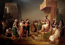 Another account traces the discovery of aguamiel to the Toltec Empire, when a noble named Papantzin was trying to get the emperor to marry his daughter Xochitl. He sent her to the capital with an offering of aguamiel, honey of the agave plant. The emperor and princess wed, and their son was named Meconetzin [mekoˈnet͡sin] (maguey son).[16] In other versions of the story, Xochitl is credited with discovering pulque.[7]