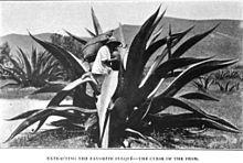 The manufacturing process of pulque is complex and requires the death of the maguey plant.[13] As the plant nears maturity, the center begins to swell and elongate as the plant gathers stored sugar to send up a single flower stalk, which may reach up to 20 feet in height. However, plants destined for pulque production have this flower stalk cut off, leaving a depressed surface 12-18 inches in diameter. In this center, the maguey sap, known as aguamiel (honeywater), collects.[14] It takes a maguey plant 12 years to mature enough to produce the sap for pulque.[15]