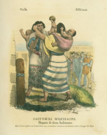 In some casta paintings, pulque consumption was depicted.[23] Some casta painters depicted different castas safely consuming and selling pulque.[24] Other casta painters depicted Indigenous Americans intoxicated in the streets, and incapacitated which as a result required their families to escort them home.[25] Italian lithographer Claudio Linati in his 1828 depictions picturesque Mexican types showed disorder in a pulquería.