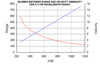 Pulse-Doppler typically uses medium pulse repetition frequency (PRF) from about 3 kHz to 30 kHz. The range between transmit pulses is 5 km to 50 km.