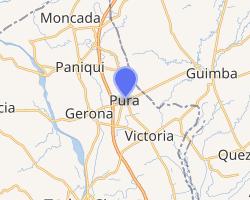 The municipality of Pura is located at the northeastern part of the Province of Tarlac, surrounded by the municipalities of Ramos (about 5 km to the north), Victoria (6.5 km to the south), Gerona (6 km to the west), and Guimba in Nueva Ecija (14 km to the east). It is about 19 kilometres (12 mi) from the provincial capital Tarlac City, 78 kilometres (48 mi) from the regional center San Fernando, Pampanga, 55 kilometres (34 mi) from Clark Special Economic Zone (CSEZ) in Angeles City, and 145 kilometres (90 mi) north of Manila.