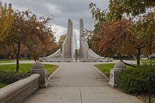The Purdue Mall is the central quad of Purdue University and was created to connect the academic campus with Ross-Ade Stadium. It is also known as the Engineering Mall due to its proximity to several engineering buildings. The most prominent feature of the Purdue Mall is the 38-foot (12 m)-tall concrete Engineering Fountain, and also features the Frederick L. Hovde Hall of Administration, which houses the office of the university president, Mitchell E. Daniels.