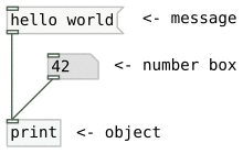 Pd supports four basic types of text entities: messages, objects, atoms, and comments. Atoms are the most basic unit of data in Pd, and they consist of either a float, a symbol, or a pointer to a data structure (in Pd, all numbers are stored as 32-bit floats). Messages are composed of one or more atoms and provide instructions to objects. A special type of message with null content called a bang is used to initiate events and push data into flow, much like pushing a button.