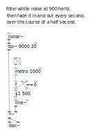 - The last, more complex patch filters white noise at 9000 Hz (with a Q of 20), then fades it in and out each second over the course of a half second. In Pd, time is measured in milliseconds, thus the '1000' is one second and the '500' is a half second.