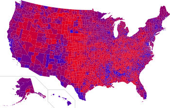 Polarization is more evident on a county scale with the growing percentage of the U.S. population living in "landslide counties", counties where the popular vote margin between the Democratic and Republican candidate is 20 percentage points or greater.[33][34][35] In 1976, only 27 percent of U.S. voters lived in landslide counties, which increased to 39 percent by 1992.[36][37] Nearly half of U.S. voters resided in counties that voted for Bush or Kerry by 20 percentage points or more in 2004.[38] In 2008, 48 percent of U.S. voters lived in such counties, which increased further to 50 percent in 2012 and to 61 percent in 2016.[36][37]