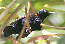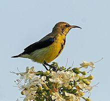 The purple sunbird (Cinnyris asiaticus) is a small bird in the sunbird family found mainly in South and Southeast Asia but extending west into parts of the Arabian peninsula. Like other sunbirds they feed mainly on nectar, although they will also take insects, especially when feeding young. They have a fast and direct flight and can take nectar by hovering like a hummingbird but often perch at the base of flowers. The males can appear all black in harsh sunlight but the purple iridescence is visible on closer observation or under good light conditions. Females are olive above and yellowish below.