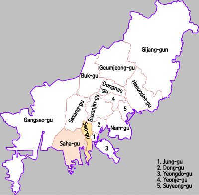 In 1957, Busan adopted a division system with the creation of six gu (districts): Busanjin-gu, Dong-gu, Dongnae-gu, Jung-gu, Seo-gu, and Yeongdo-gu. Today, Busan is divided into fifteen gu and one gun (county).