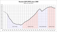 During his first tenure as president, the Russian economy grew for eight straight years, with GDP measured by purchasing power increasing by 72%, real incomes increased by a factor of 2.5, real wages more than tripled; unemployment and poverty more than halved and the Russians' self-assessed life satisfaction rose significantly.[8] The growth was a result of a fivefold increase in the price of oil and gas which constitute the majority of Russian exports, recovery from the post-Communist depression and financial crises, a rise in foreign investment,[9] and prudent economic and fiscal policies.[10][11] Putin served as Prime Minister under Dmitry Medvedev from 2008 to 2012, where he oversaw large scale military reform and police reform. In 2012, Putin sought a third term as president and won with almost 64% of the vote.[12] Falling oil prices coupled with international sanctions imposed at the beginning of 2014 after Russia's annexation of Crimea and the Russo-Ukrainian War led to GDP shrinking by 3.7% in 2015, though the Russian economy rebounded in 2016 with 0.3% GDP growth, and the recession officially ended.[13] Development under Putin has included the construction of pipelines, the restoration of the satellite navigation system GLONASS, and the building of infrastructure for international events such as the 2014 Winter Olympics in Sochi. Putin received 76% of the vote in the 2018 election and was re-elected for a six-year term ending in 2024.