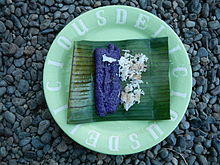 - Puto bumbong – traditionally made from a special variety of sticky or glutinous rice (called pirurutong) which has a distinctly purple colour. The rice mixture is soaked in saltwater and dried overnight and then poured into bumbóng (bamboo tube) and then steamed until steam rises out of the bamboo tubes. It is served topped with butter or margarine and shredded coconut mixed with moscovado sugar. It is commonly eaten during Christmas in the Philippines along with bibingka, another type of rice cake.[8]