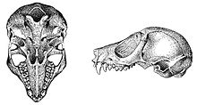 The pygmy slow loris has a head and body length (measured from the top of the head to the base of the tail) of 195–230 mm (7.7–9.1 in); there is no significant difference in size between the sexes.[19] The length of the skull is less than 55 mm (2.2 in).[20] The tail is short, averaging 1.8 cm (0.71 in) in length.[21] The bodyweight ranges between 360 and 580 grams (13 and 20 oz),[22] with an average mass of 420 grams (15 oz) for males and 428 grams (15.1 oz) for females. There are, however, large seasonal variations in bodyweight, and individuals up to 700 grams (25 oz) have been recorded. The animal tends to have significantly higher bodyweights during the winter months, about 50 percent higher than the lowest values in the summer. The weight gains, achieved largely by increasing food intake, are triggered by changes in the length of the day and night. This seasonal change in bodyweight occurs in both sexes, in both pregnant and non-pregnant females—an adaptation thought to help ensure survival during winter when food resources become scarce.[23] The species has distinctive teeth morphology: its third molar is triangular in outline and only slightly smaller than the first molar; its second molar is the largest.[24] The incisors and canines on its lower jaw are procumbent (tilt forward) and together form a toothcomb that is used in grooming and feeding.[25]