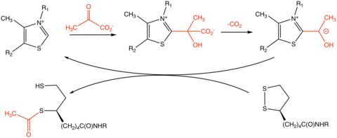 The thiamine pyrophosphate (TPP) converts to an ylide by deprotonation. The ylide attack the ketone group of pyruvate. The resulting adduct decarboxylates. The resulting 1,3-dipole reductively acetylates lipoamide-E2.[2]