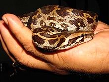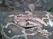 Python molurus is a large, nonvenomous python species native to tropical and subtropical regions of the Indian subcontinent and Southeast Asia.[2] It is known by the common names Indian python, black-tailed python,[3] Indian rock python, and Asian rock python.[4][5] It is generally lighter colored than the Burmese python and reaches usually 3 m (9.8 ft).[6]