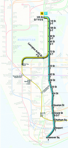 On January 1, 2017, the first phase of the Second Avenue Subway opened; the Q was extended from 57th Street–Seventh Avenue to 96th Street via the BMT 63rd Street Line and the IND Second Avenue Line. This extension serves Lexington Avenue–63rd Street station with a cross-platform transfer to the IND 63rd Street Line (served by the F and <F> trains) before serving new stations under Second Avenue at 72nd Street, 86th Street, and 96th Street, where it originates/terminates.[36] The inaugural train on the Second Avenue Line ran on December 31, 2016, with passenger service beginning the next day. From January 1 to 9, 2017, service between 57th Street and 96th Street ran only from 6 a.m. to 10 p.m., with late-night service terminating at 57th Street; late night service to 96th Street began on January 9.[37][38]